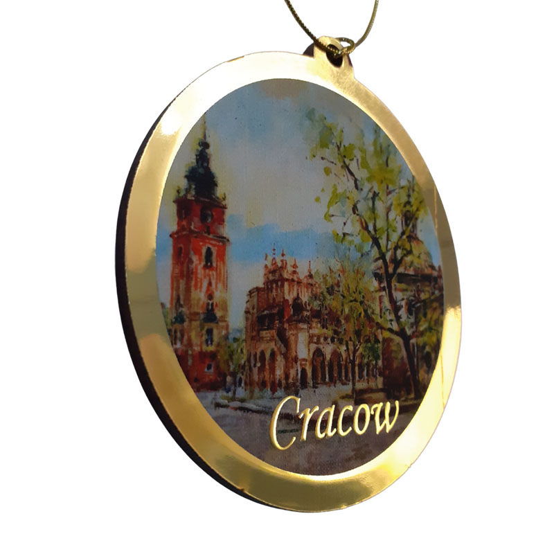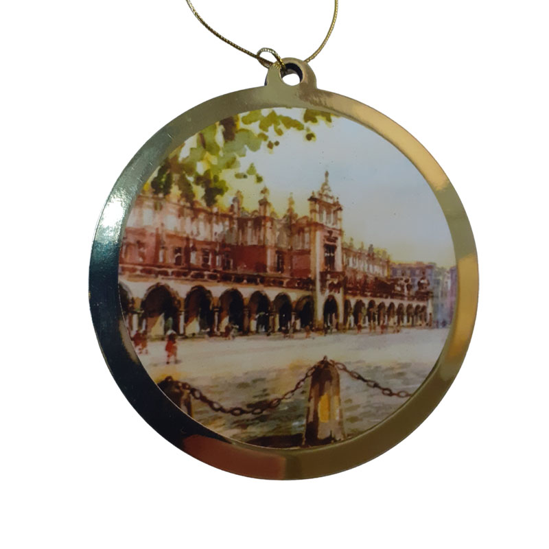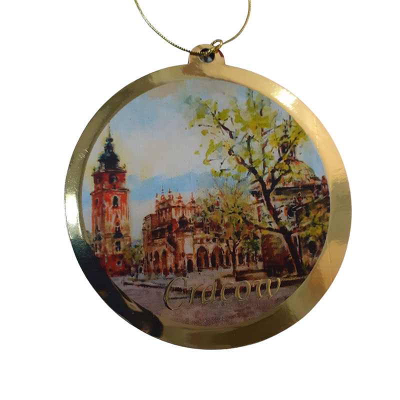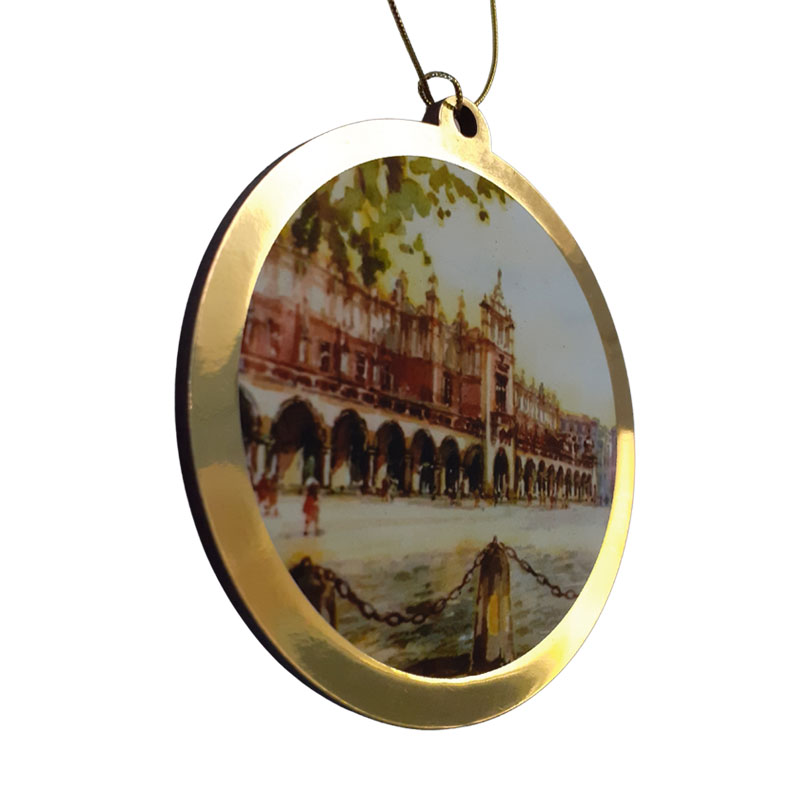 Kolorowa dwustronnie bombka o wielkości 8,5 cm, wykonana z drewna, z piękną grafiką przedstawiającą Sukiennice, ozdobiona delikatnymi, złoconymi detalami. Dołączony jest złoty sznureczek do zawieszenia na choince.